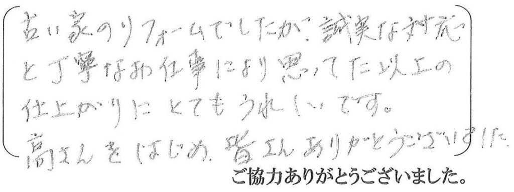 今回は和室から洋室化をメインにクロス、洗面台など多岐に渡り工事をさせて頂きました。お客様には毎日お気遣い頂き、我々も気持ち良く仕事をさせて頂く事が出来て大変感謝しております。この度は誠にありがとうございました。