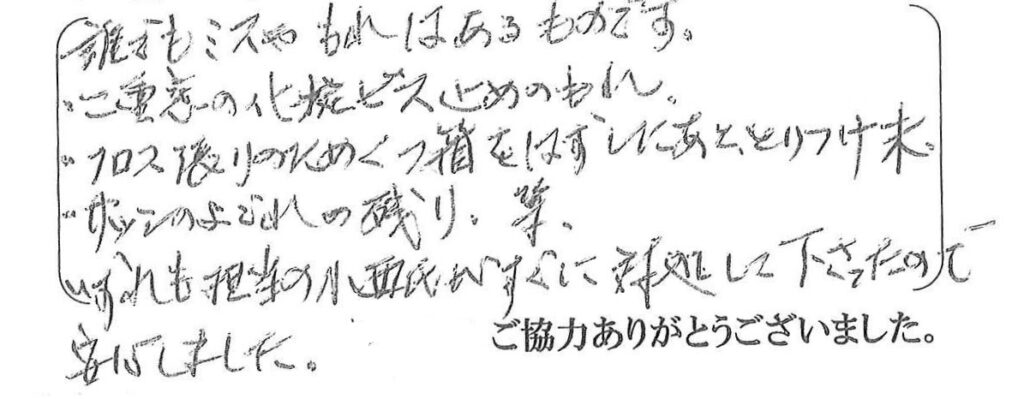 この度は、内装工事や窓サッシ工事などをご依頼いただきましてありがとうございました。空き家でのリフォームでしたが、毎日お立会いいただき大変感謝しております。何点か工事中の不具合もあり、ご迷惑をおかけする場面もございましたが、何かあった際は誠心誠意スピード対応をモットーにしております。今後共お住まいの事は何でもお気軽にお問い合わせください。引き続きどうぞよろしくお願い致します。