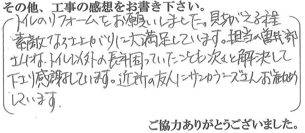 この度はトイレ工事のご依頼を頂き、ありがとうございました。ご満足いただける工事・サービスをご提供させて頂けましたことを心より嬉しく思います。今後も何かご自宅のお困りごとがございましたら、お気軽にお申し付け下さいませ。どうぞよろしくお願い申し上げます。