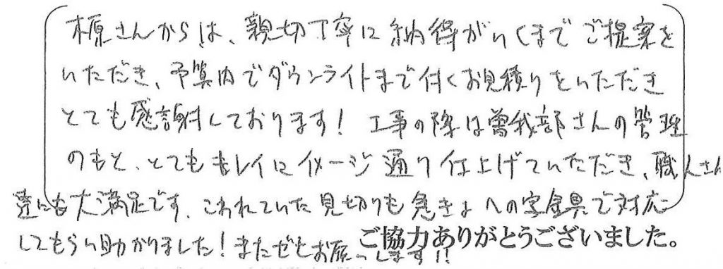 この度は洗面所のリフォームをご依頼頂き、ありがとうございました。嬉しいご感想も頂くことができ光栄に感じております。今後もリフォームの事でしたら、何なりとお気軽にご相談くださいませ。