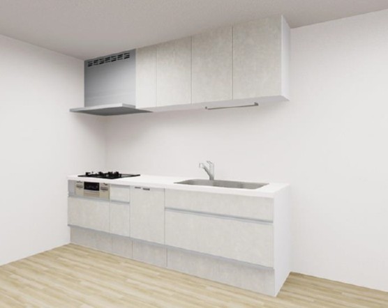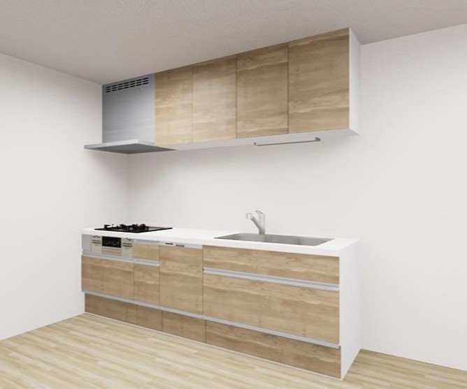 人造大理石ワークトップ/スライド収納仕様/ フラットスリムレンジフード/ 引出しホース付き水栓/深型食洗機/ガラストップコンロ