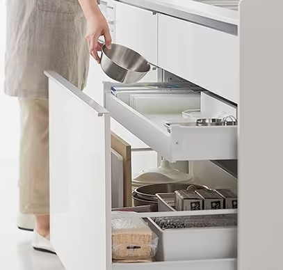 一段式の引出しだから、必要なものがどこにあるかすぐわかります。大型の調理道具も収納できて便利。すっきりとしたシンプルなデザインの収納です。内引出しにはラップやボウル、スクイーザーなどのかさばるキッチン⼩物が使い勝⼿よく整理できます。