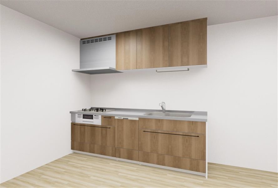 ステンレスワークトップ/ステンレスキャビネット/ フラット型レンジフード/ シングルレバーシャワー水栓/浅型食洗機/ガラストップコンロ