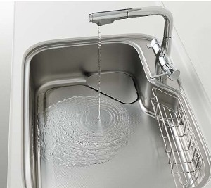 お料理中などに使う水が、ゴミや汚れを手前の「流レール」に集めながら流れます。「流レール」に入ったゴミは水流に押されて排水口に集まる仕組み。調理中からシンクをキレイに保ちます。