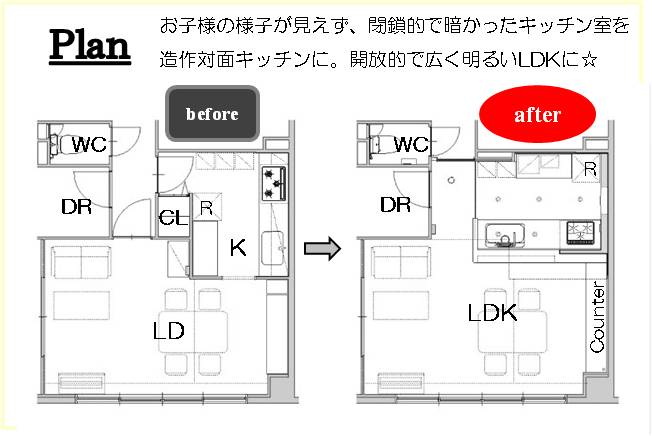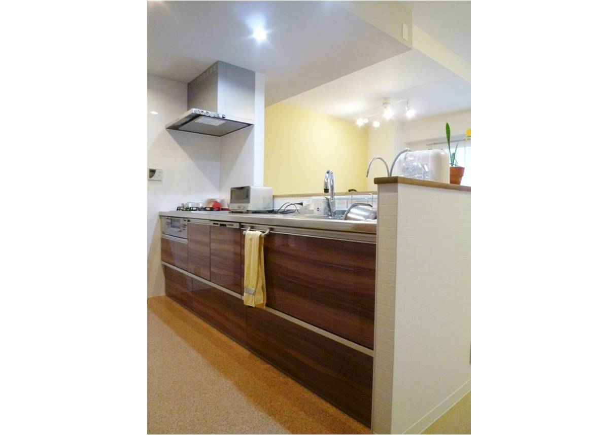 下り天井のキッチン上は、ダイニングに選ばれたライトイエローに合う優しいグレーをご提案。キッチン廻造作壁は、ホワイトのレンガ調クロスで、奥様お好みの北欧スタイルの空間に。