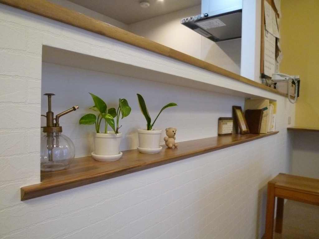 ダイニングテーブルの高さに合わせて造作壁にニッチを。本なども置けてテーブルはスッキリ。