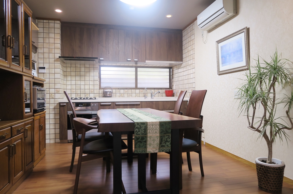 キッチン新調と共に床暖房を導入、廊下まで床を貼り替えました。隣のお部屋が広い和室なので、和風の雰囲気を壊さず、また既存のイタリアンタイルに合うカラーコーディネートで、落ち着いたダイニングキッチンになりました。