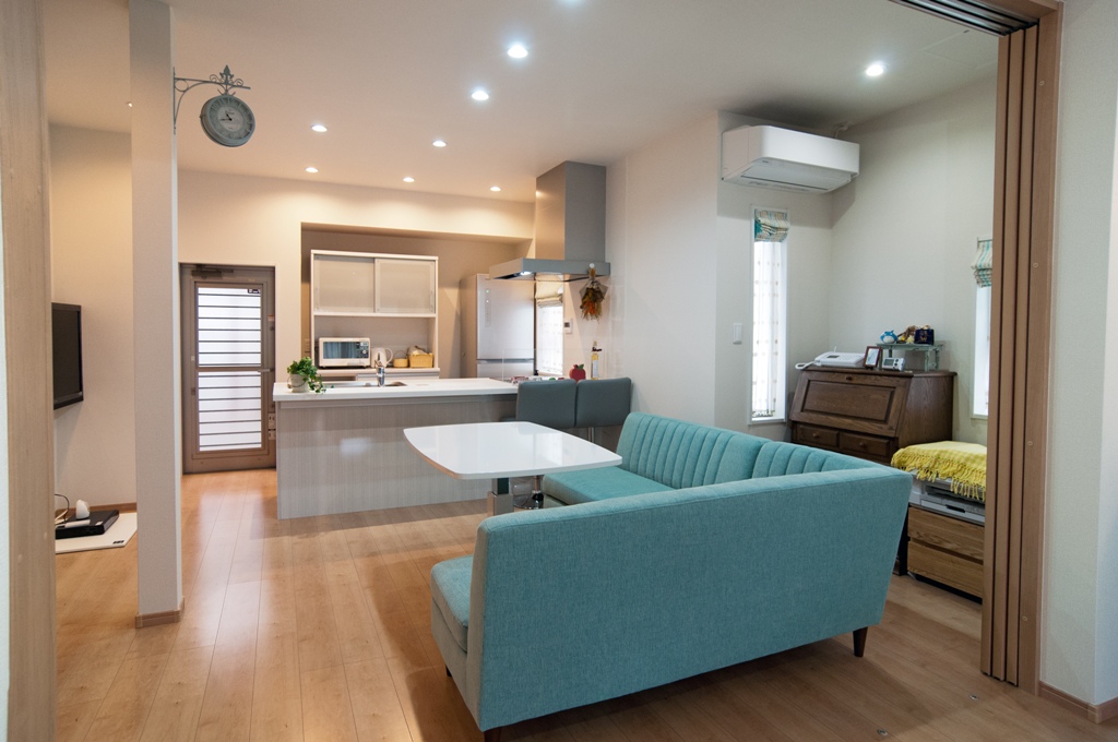 北側にあったLDKと南側の部屋を繋げ明るく広い一つの空間を提案。3枚の扉で間仕切れる工夫をしました。