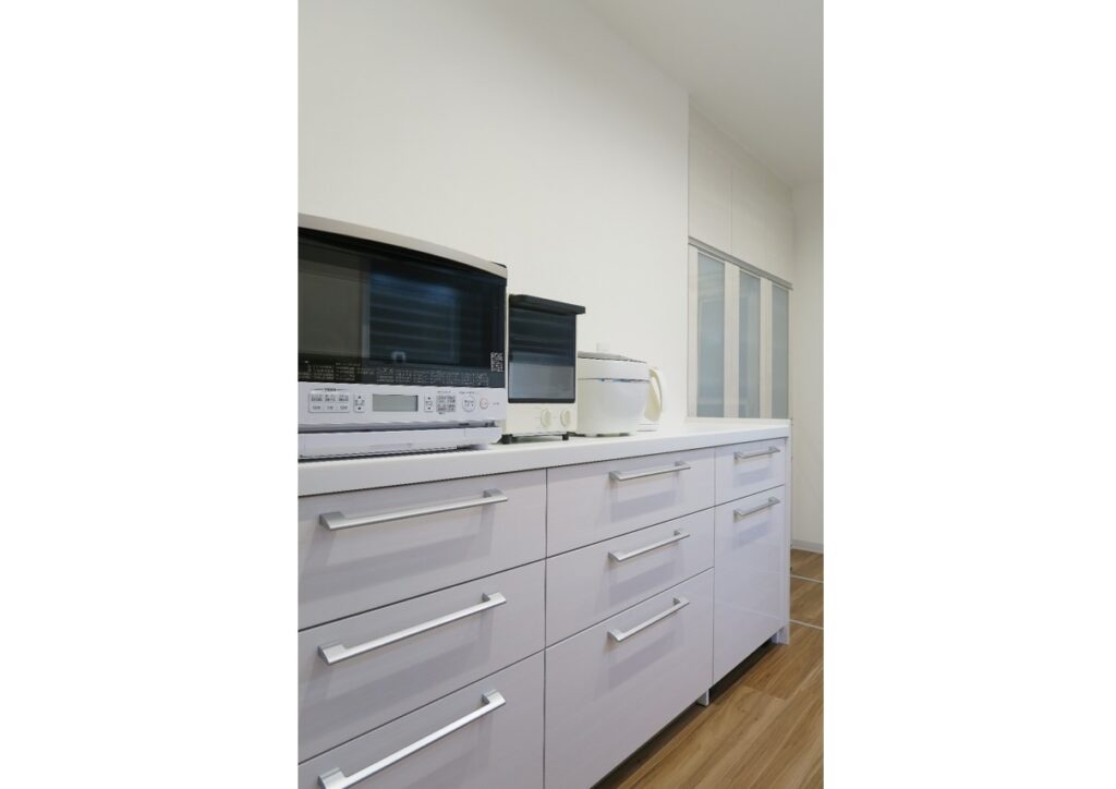 凹み部分は、内に納まるD320のカップボードにし、手前の壁と面になるように設置。ホワイト系カラーとライン取手にしたので、壁の一部に溶け込み、圧迫感なくスッキリ納まりました。