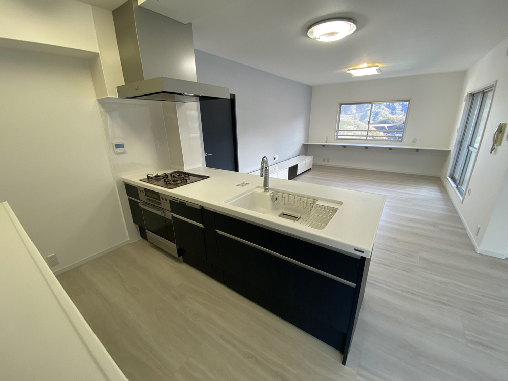 西宮市のマンションリフォーム。広々としたカウンタータイプのスタイリッシュなシステムキッチン。