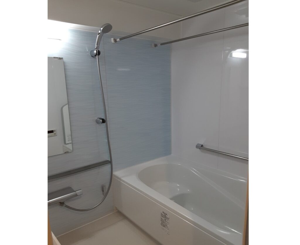 やわらかなアクアブルーのアクセントパネルとルフレトーンホワイト浴槽で爽やかなイメージに。