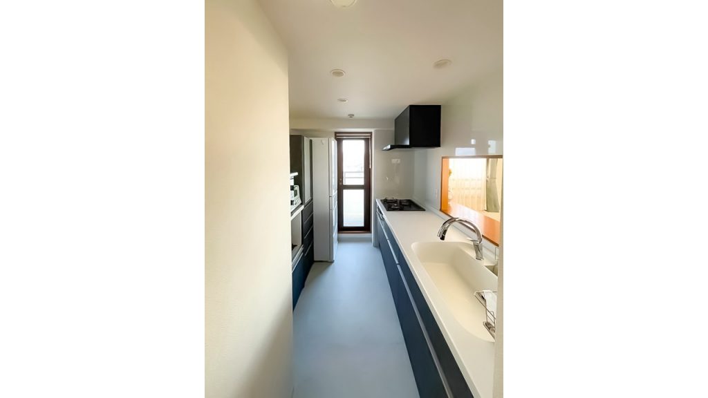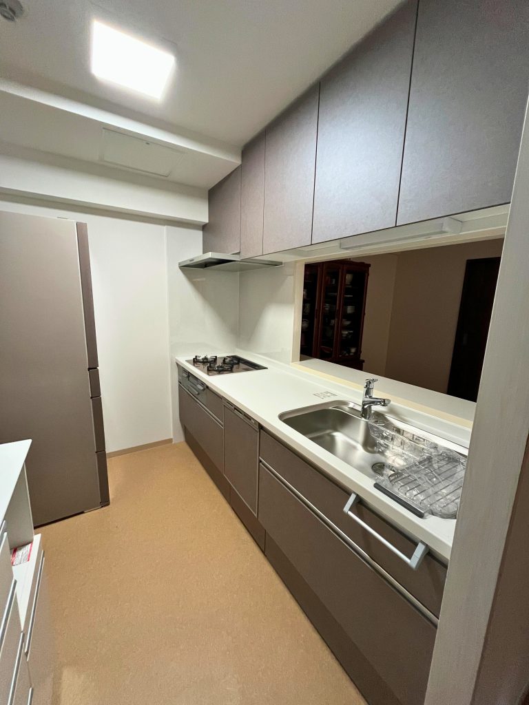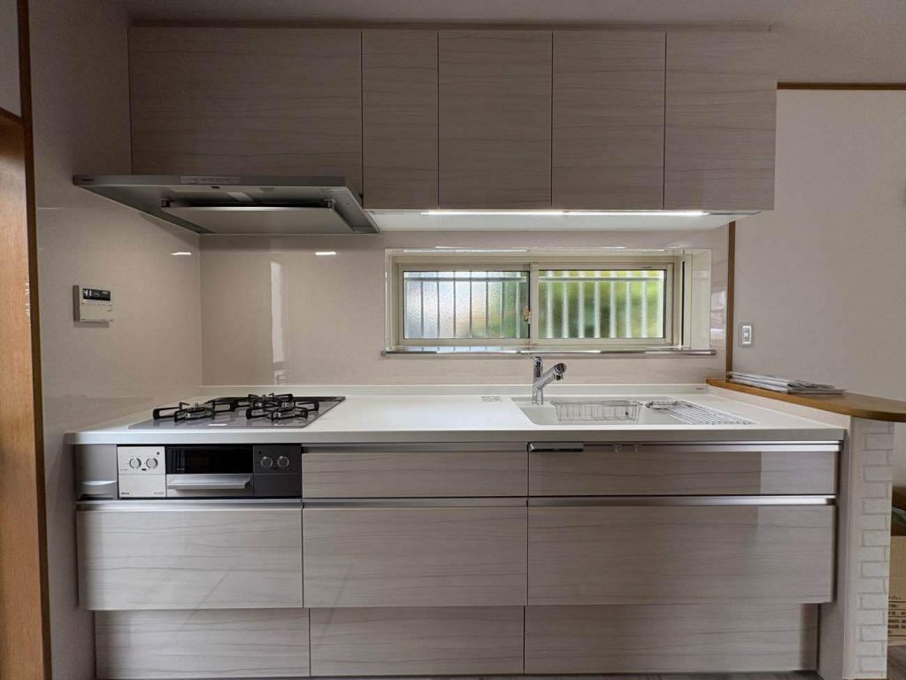 スライディングドアで通路スペースを干渉せず、物の出し入れもスムーズな収納量抜群のカップボード。キッチンコンセントやお手入れが楽なフード・コンロ等、キッチン設備も充実。