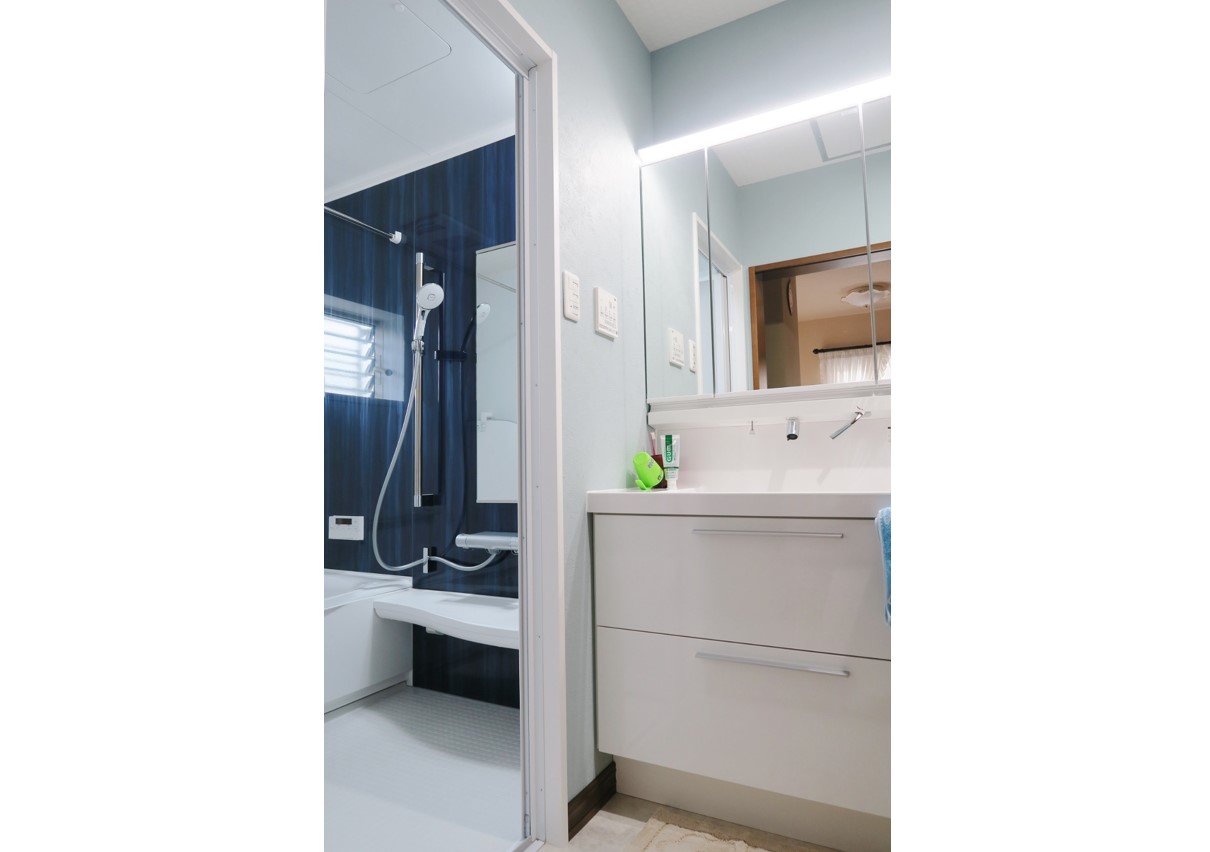 洗面台を広く。三面鏡の収納があるので、サイドはカウンターキャビネットのみにし、物がスッキリ納まる洗面室に。