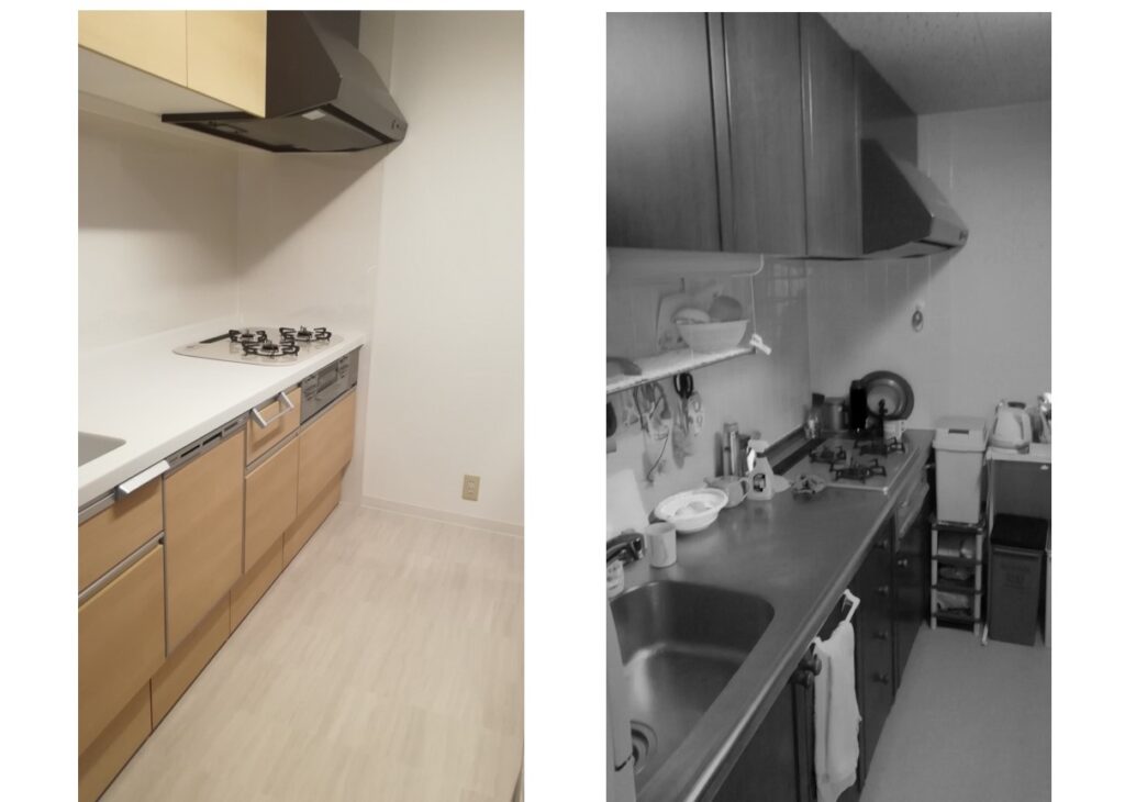 人造大理石の天板とシンクを同系色でまとめる事でさらにキッチンをスッキリとさせています。