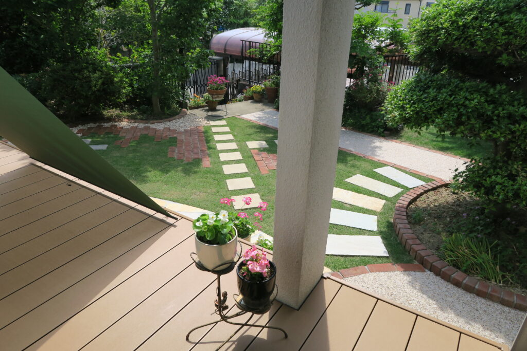 ・お手入れがたいへんな大きな芝生を、ウッドデッキや石材でおしゃれにまとめたこと