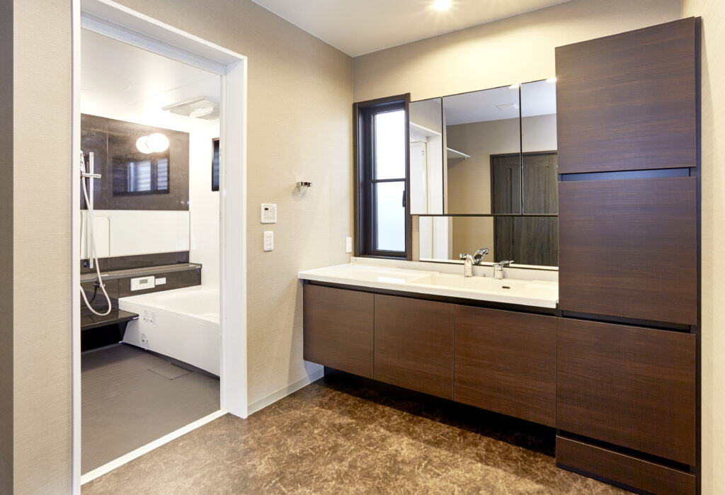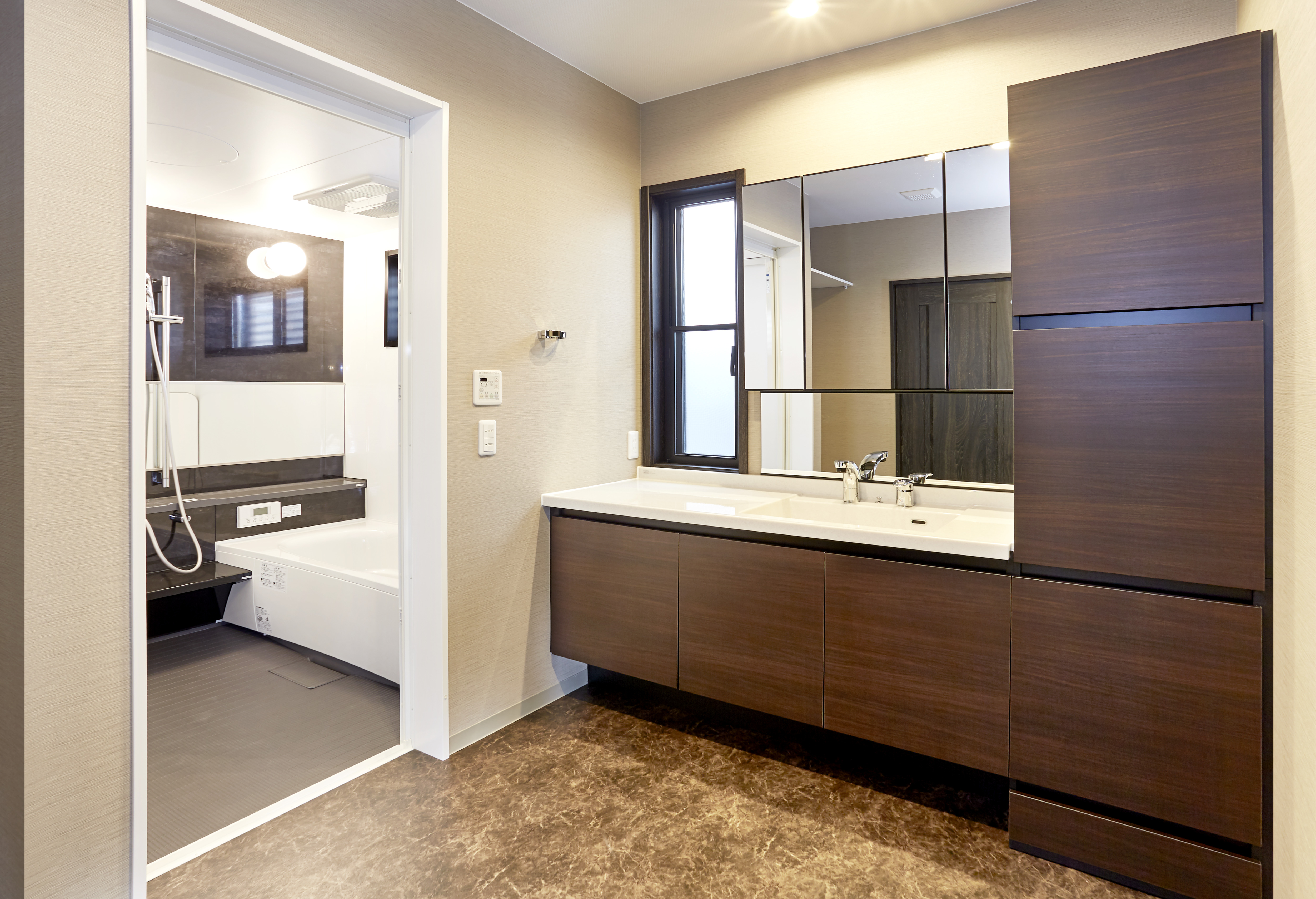・浴室・洗面所はダークな色味を基調に、シックで落ち着いた空間に仕上げたこと