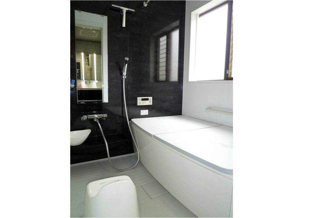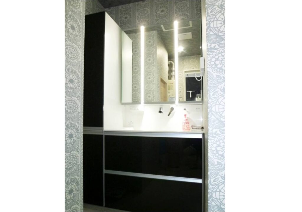 ブラックのアクセントパネルが映える浴室と、写真ではわかりづらいですが深いグリーンの洗面化粧台が非日常的な雰囲気にしています。