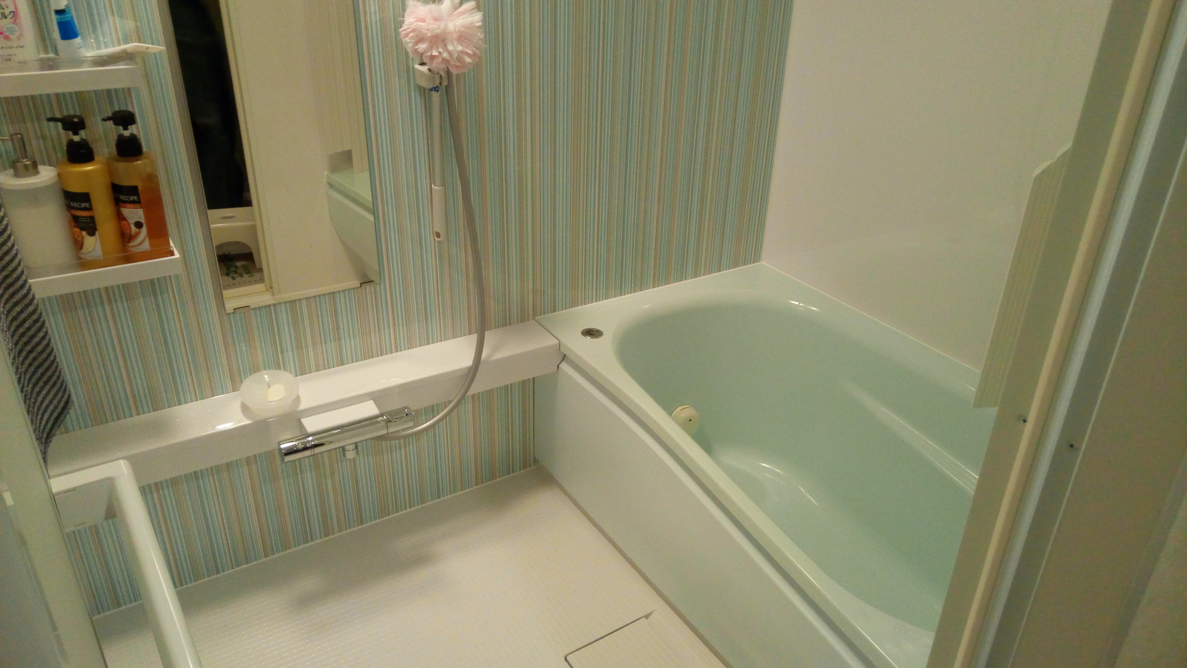 普通のストライプとは違い、太さも配色も単色ではなく綺麗な配色のストライプのパネルが一面にあり、気に入りのお風呂で毎日のバスタイムが爽やかで楽しくなりますね♪また、寒い季節も床がが冷たくなく安心です。