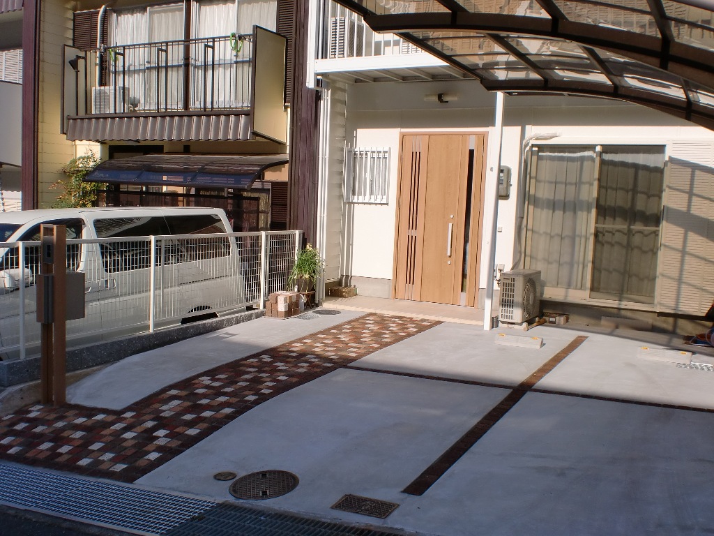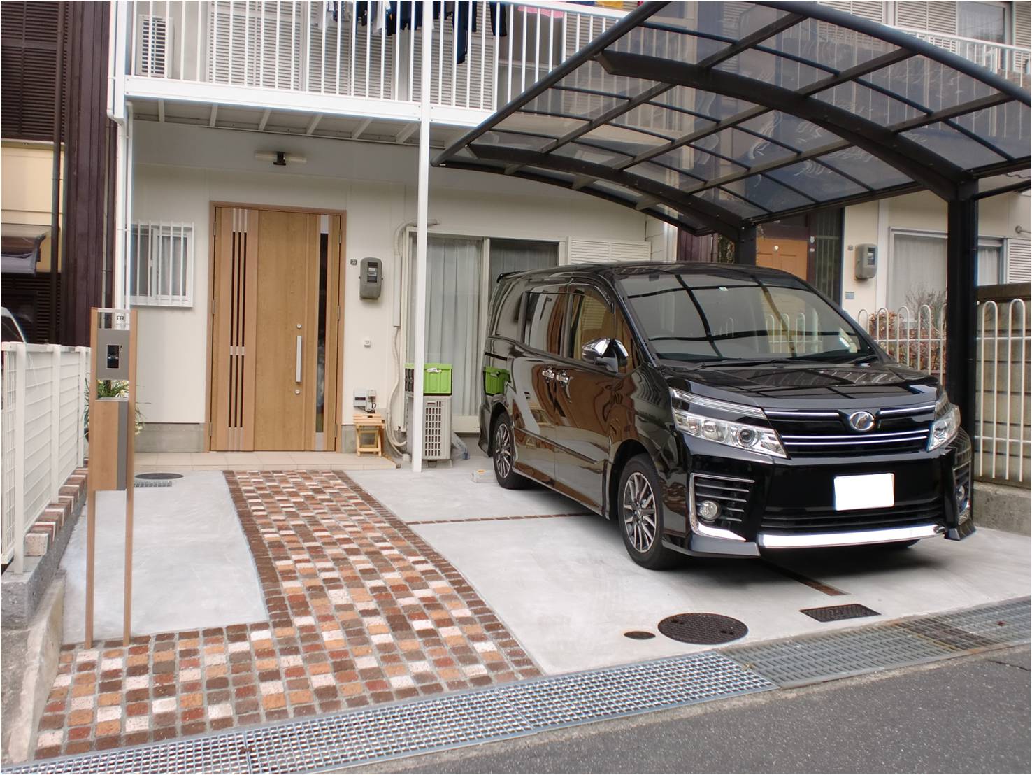 広い駐車場。アプローチには自由なデザイン性と使い勝手のよいサイズで人気のあるピンコロのレンガタイルを提案しました。5色使いでバラエティに富んだ空間になりました。