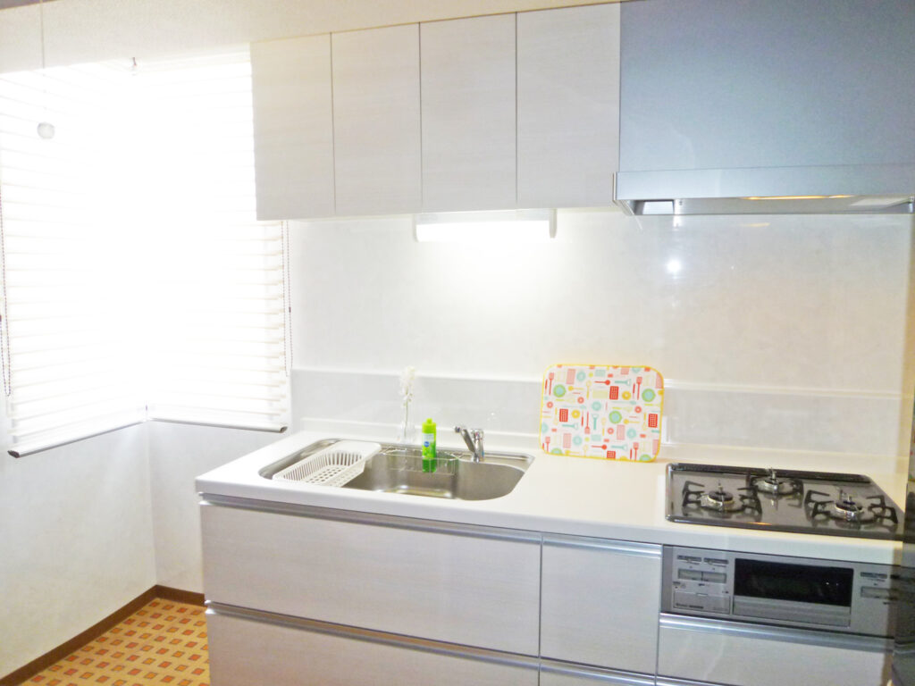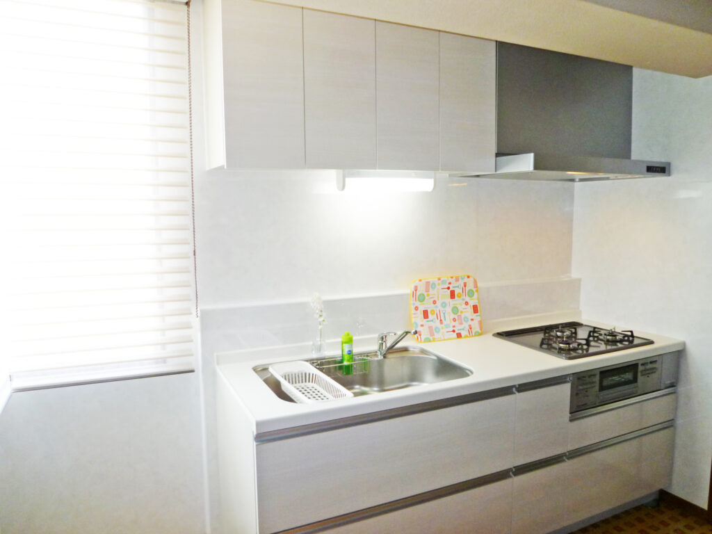 グリーンのタイルが印象的だったセクショナルキッチンがホワイトを基調としたシステムキッチンに